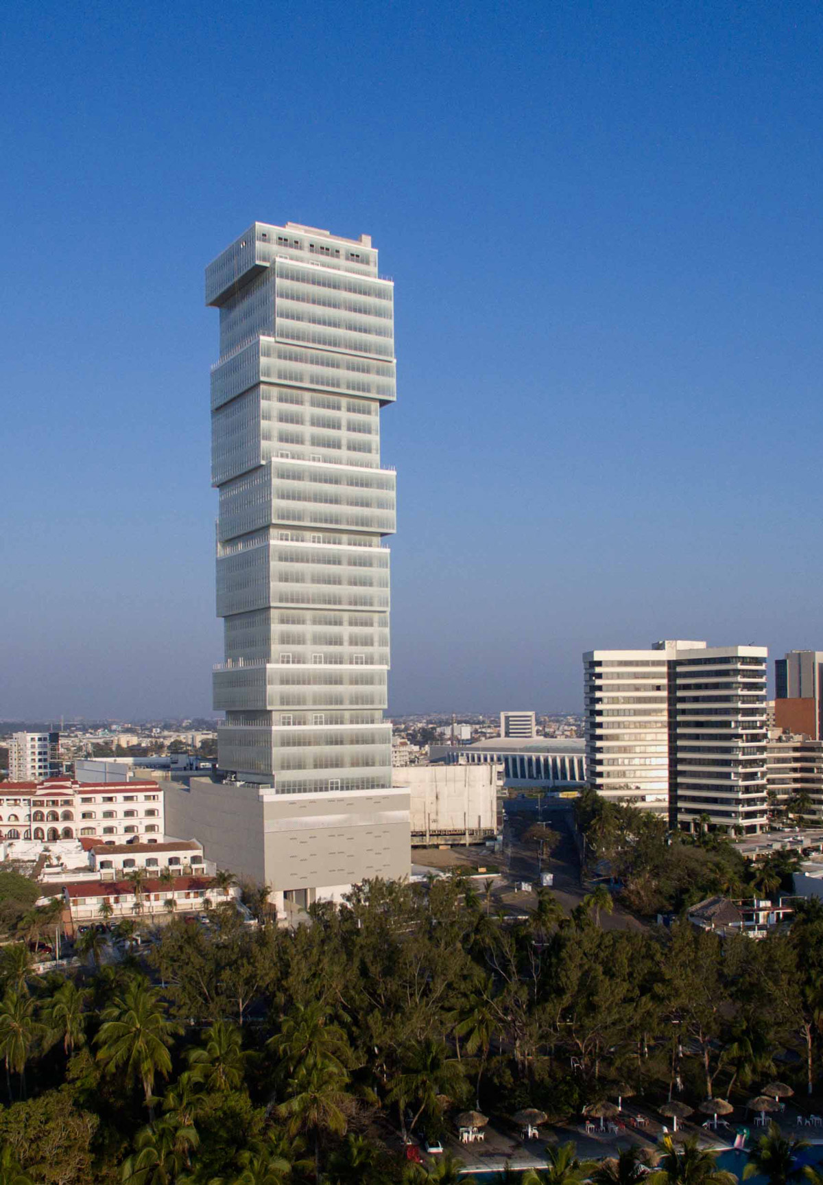 Exertia is an executive tower with 33 levels, plus 6 parking levels with 522 spaces. On the ground floor there is the lobby and a coworking area for the users of the tower, from level 1 to 5 all floors are used for parking, on level 6 there is parking and an area for different amenities for the tower, on level Offices 7 to 33 are located, with 8 offices per floor.